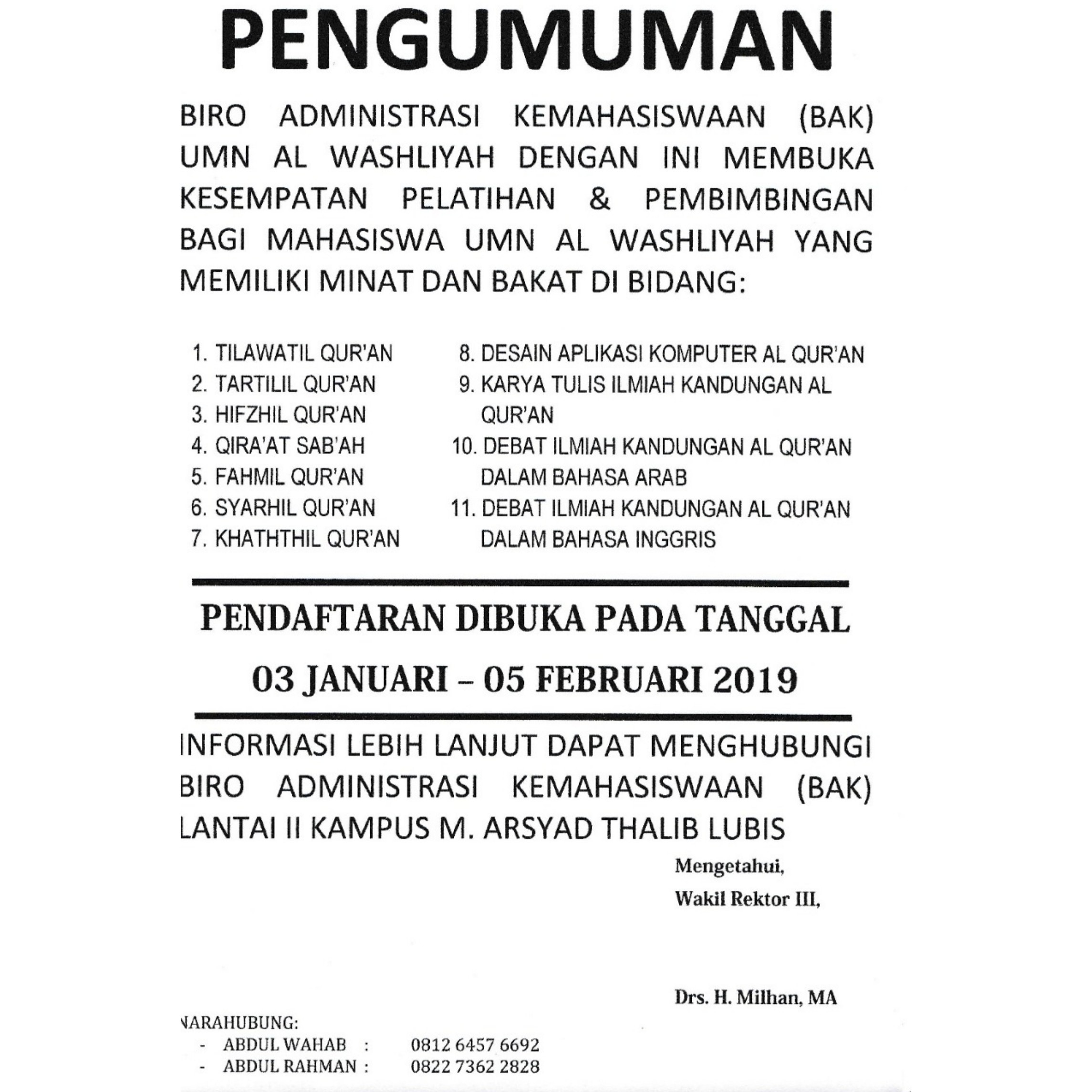 KESEMPATAN PELATIHAN & PEMBIMBINGAN DALAM BERBAGAI BIDANG Posted by admin Categories Pengumuman Date Januari 8, 2019 Share: admin Previous post INALUM CALLING ALL STUDENTS! Januari 8, 2019 Next post SELEKSI PEMILIHAN MAHASISWA BERPRESTASI (PILMAPRES) 2019 UMN AL WASHLIYAH Januari 15, 2019 You may also like Pemberitahuan UAS Ganjil TA. 2025-2026 8 Desember, 2025 Pemberitahuan Batas Akhir Ujian Sidang Meja Hijau 8 Desember, 2025 Brosur, Insentif dan Cara Pembayaran Uang Kuliah 2 Juli, 2025