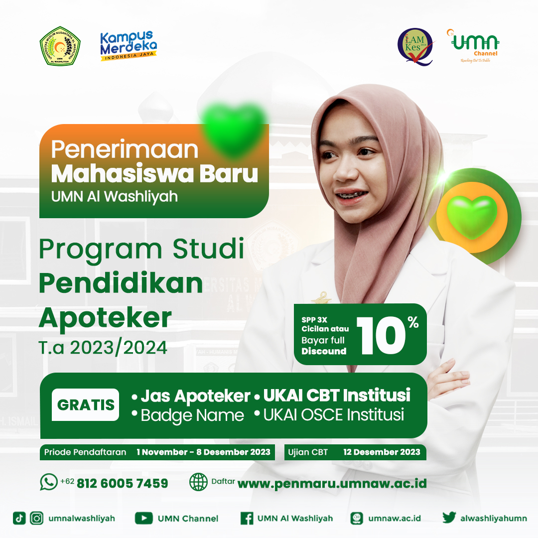 Program Studi Pendidikan Profesi Apoteker (PSPPA) UMN Al Washliyah telah dibuka. Tentunya banyak sekali keuntungan yang diperoleh jika kamu mendaftarkan diri di PSPPA UMN Al Washliyah seperti SPP dapat dicicil 3 kali dan sudah gratis jas apoteker. Jika kamu langsung melunasi SPP selama 1 tahun, kamu juga akan mendapatkan potongan sebesar 10%.